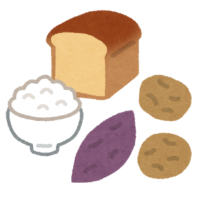 炭水化物のこと。穀物・砂糖・芋類などに含まれるエネルギー源。